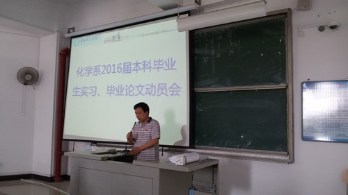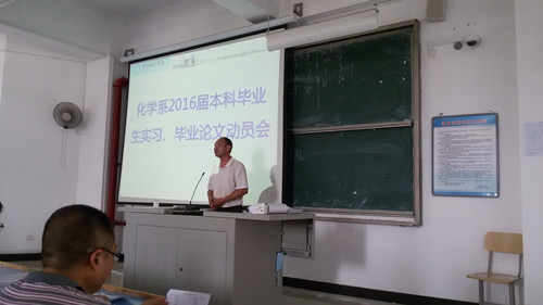 6月30日上午在化学系CC401教室召开了2016届本科生毕业论文、实习动员大会。化学系主任颜桂炀、党总支书记游东宏、化学系副主任应少明、实习负责人、12级辅导员、实习指导教师、部分毕业论文指导教师参与会议。会议由应少明教授主持。颜桂炀主任首先针对实践教学重要性做了发言,颜桂炀主任指出毕业论文、实习都是培养方案中的必修环节,如果这两门课程不会过,那是无法毕业,自然也不能获得学位了,要求同学们务必高度重视。要充分认识实习的重要意义,把实习作为锻炼自己的一次最重要的机会。接着党总支书记游东宏指出外出实习纪律的重要性,要求在实习中要处理好个人与实习单位的关系、个人与指导教师的关系。之后两个专业实习负责人谢红璐教授和薛岚老师分别对应化、化学专业实习做具体部署。