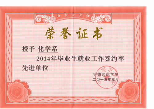 化学系大学生就业工作始终坚持以服务为宗旨,以就业为导向,深化教育教学改革,不断创新人才培养模式。系就业指导中心积极联系用人单位,发布就业信息,扶持帮助就业困难学生,培养了一批教学与应用型人才,受到用人单位好评和社会的普遍认可,毕业生当年就业率均在95%以上。2014年经全系师生共同努力,我系毕业生就业率和签约率又上一个台阶,受到学校的表彰。荣获了我校2014年毕业生就业工作先进集体、签约率先进单位和就业先进个人荣誉称号。