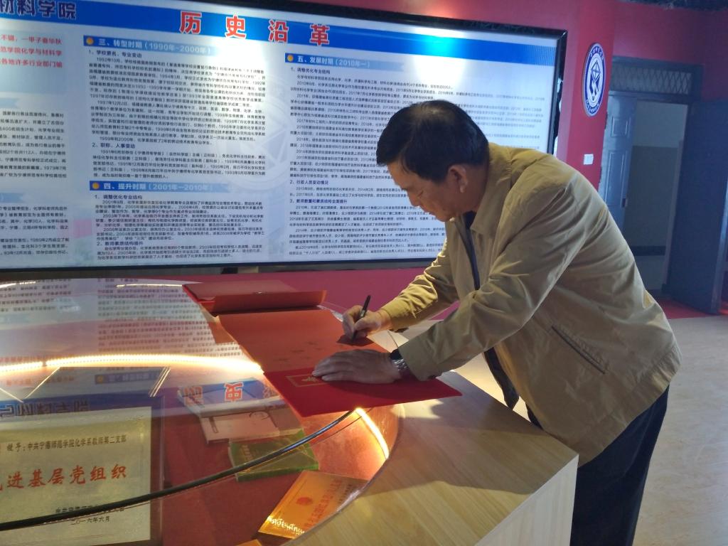 在展示馆游书记向林跃鑫教授介绍了我院走过的筚路蓝缕的历程和前辈们为我院发展所付出的心血,以及我院现如今的各项工作的发展现状。林跃鑫教授非常认真地听取了讲解,观看了每个版面并询问了一些内容。他特别在学院前言和老领导版面前驻足停留仔细观看,对学院近年来在人才队伍建设、学科发展、科研平台建设的快速发展深感欣慰,对老一辈为化学与材料学院的发展奠定的基础和做出的榜样表率给予高度的肯定,并且他也对新一辈的茁壮成长以及所取得成绩由衷高兴。他说道,我们要不忘初心,继承和发扬老一辈的吃苦拼搏的精神,充分发挥高层次人才在科研和服务地方方面主力军的作用,深化校企合作,在人才培养和产教融合做的更好,把化学与材料学院明天的篇章写得更加辉煌灿烂。最后他在留言簿上欣然写下“可喜、可贺、可期”的寄语,勉励我院师生加倍努力,在新的历史征程中更上一层楼。(图/文 周罗椿)