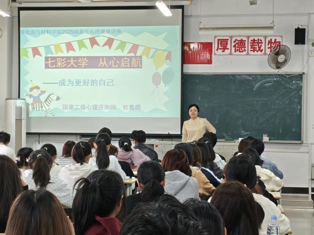 10月30日,新能源与材料学院举办“七彩大学 从心启航——成为更好的自己”专题讲座,由国家二级心理咨询师欧嘉烟老师主讲,围绕从心出发为心赋能、认识管理情绪、认识情绪背后的压力源、如何提高心理韧性四大维度为新生提供心理调适指导。