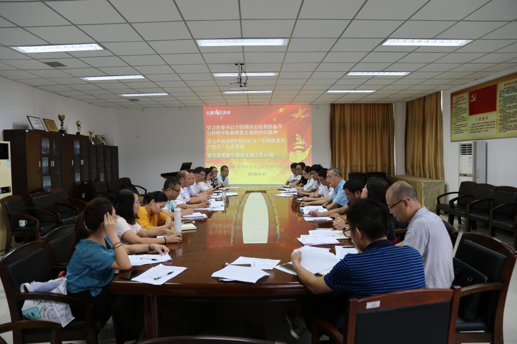 2018年9月11日下午,化学与材料学院教师党支部在院会议室召开主题党日活动。活动除了支部全体党员教师外,还邀请了以普通党员身份参加的校党委书记夏良玉、副书记徐晓丹以及校党政部门的负责人。主题活动由教师党支部书记叶陈清主持。