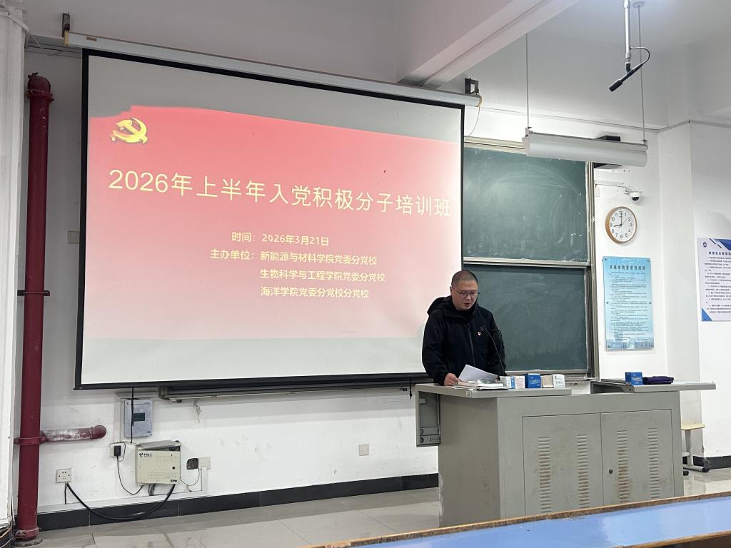 为深入学习贯彻习近平新时代中国特色社会主义思想,引导入党积极分子坚定理想信念、端正入党动机、规范党员发展流程,根据校党委党校工作部署,新能源与材料学院、生物科学与工程学院、海洋学院分党校联合举办党校第33期入党积极分子培训班。