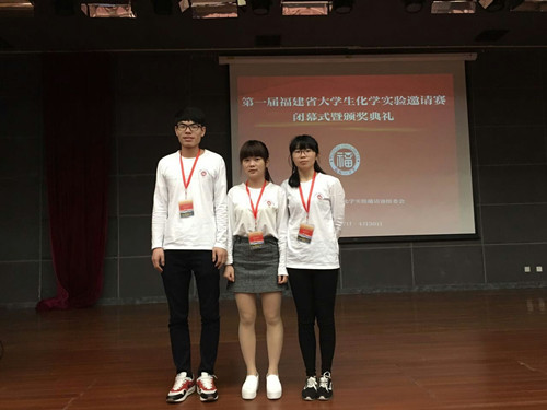 近日,由化学系黄晓辉老师和谢丹华老师为指导教师,化学系13级学生倪宁宁、林婉丽、郭汉涛为队员的参赛队伍在“第一届福建省大学生化学实验邀请赛”中获得佳绩。倪宁宁获得二等奖,林婉丽、郭汉涛获得三等奖。