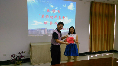 会议期间,谢向东副校长为2015年度取得优异成绩的“优秀教师”获得者吴艳玲老师和“优秀学生”林婉丽同学颁发奖状和奖金。谢副校长指出,化学系成立我校首个“奖教助学基金”,体现出化学系领导班子工作扎实、工作创新意识强,作为化学系联系企业、服务地方的特色工作之一,希望有更多企业代表能加入到该基金来;同时,他鼓励全系教师要以受表彰的教师为榜样,爱岗敬业、潜心教学,为学校做出更大贡献。接着,颜桂炀主任和游东宏书记分别为曾雪芹、郭巧英等8位同学颁发了助学金。