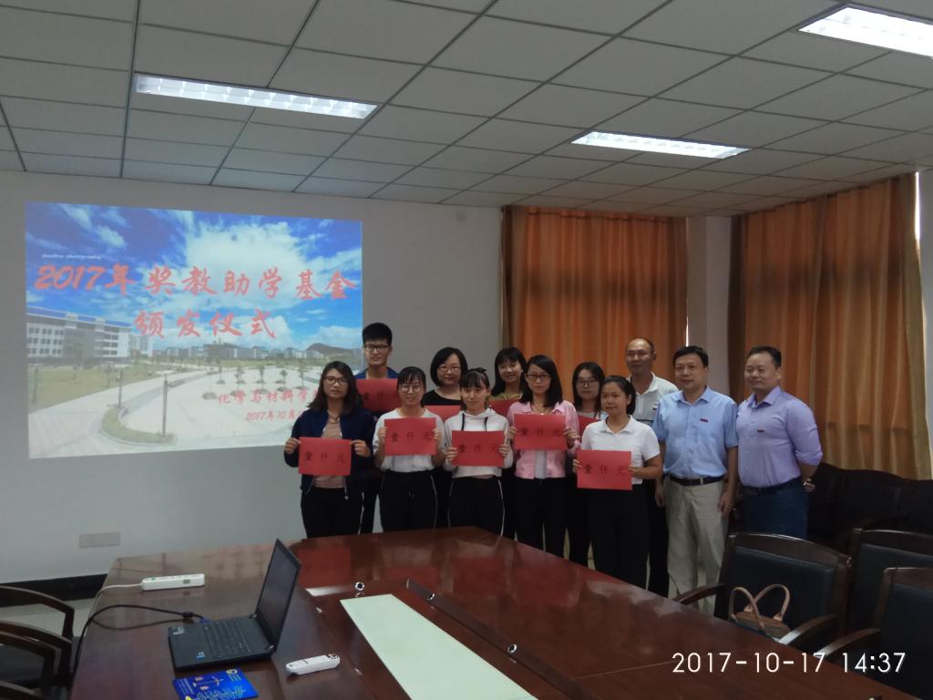 10月17日下午,在化学与材学院会议室隆重举行了2017年度“奖教助学基金”颁奖大会,副校长颜桂炀、院党委书记游东宏、副院长应少明等全院教师和学生代表出席大会,大会由游东宏书记主持。