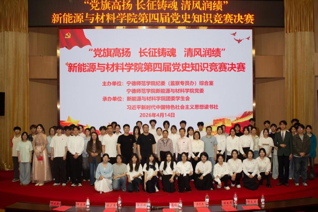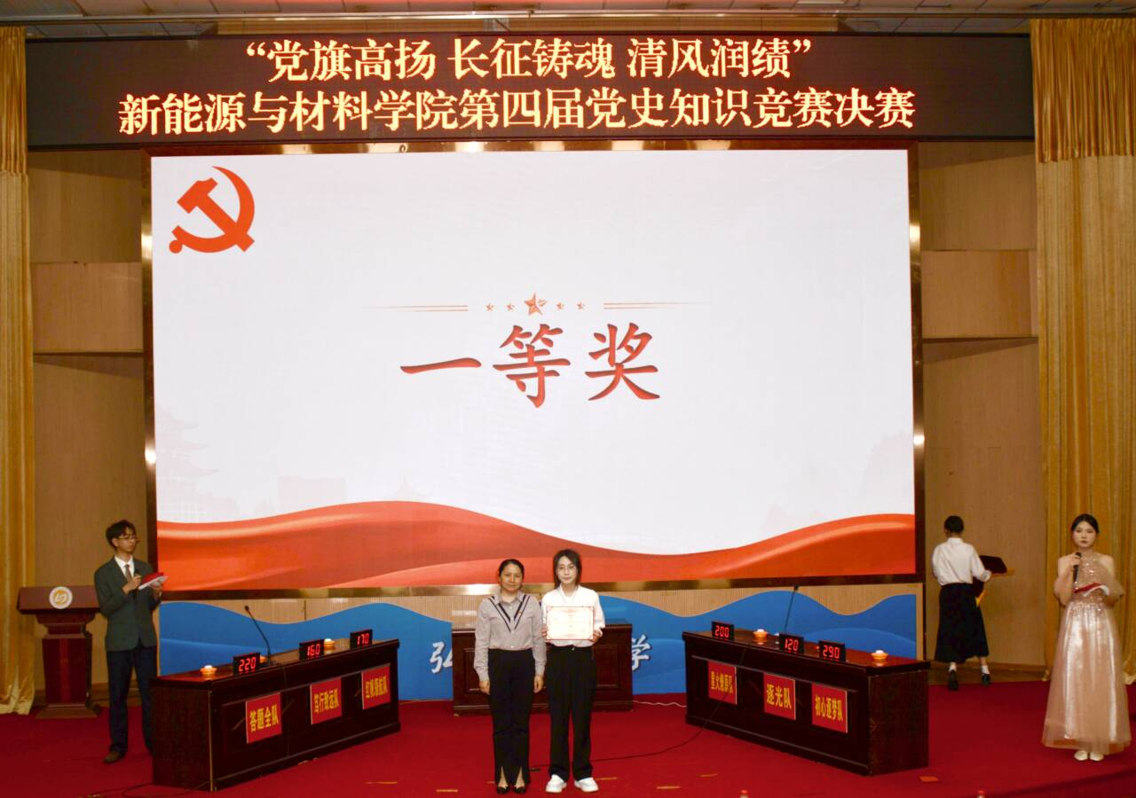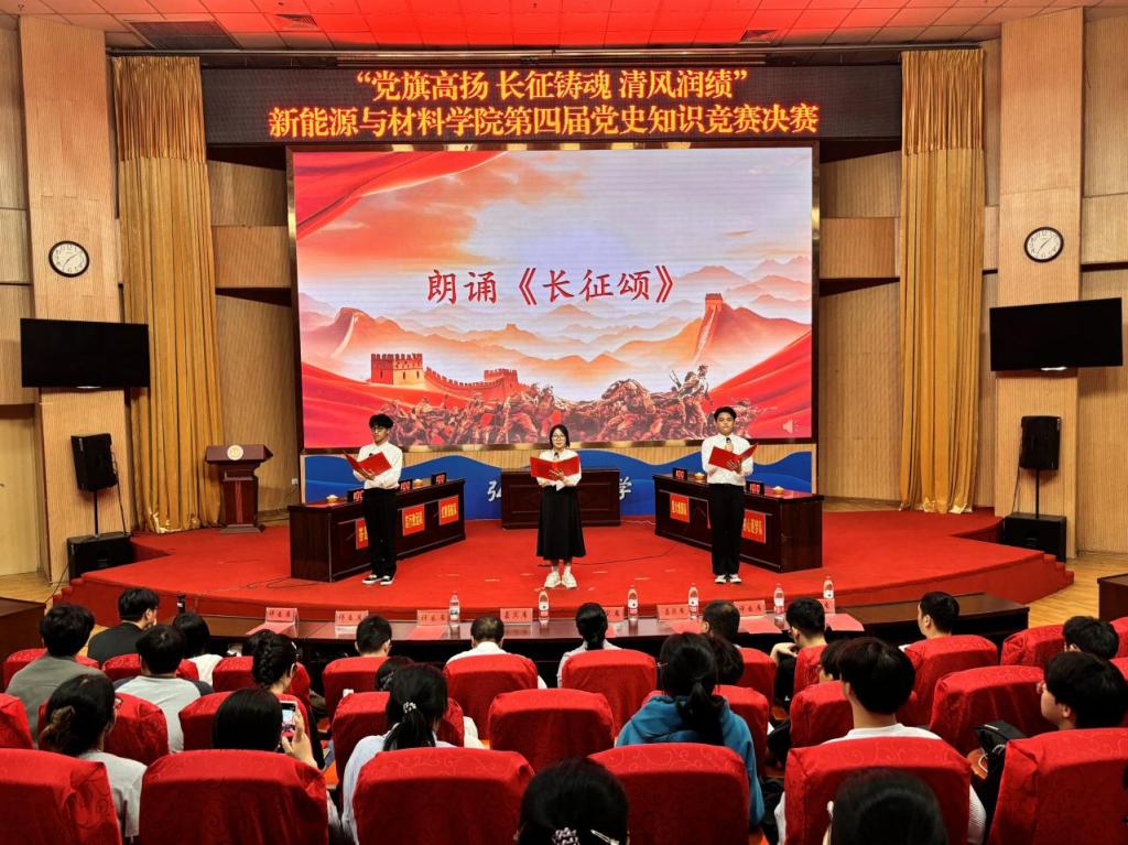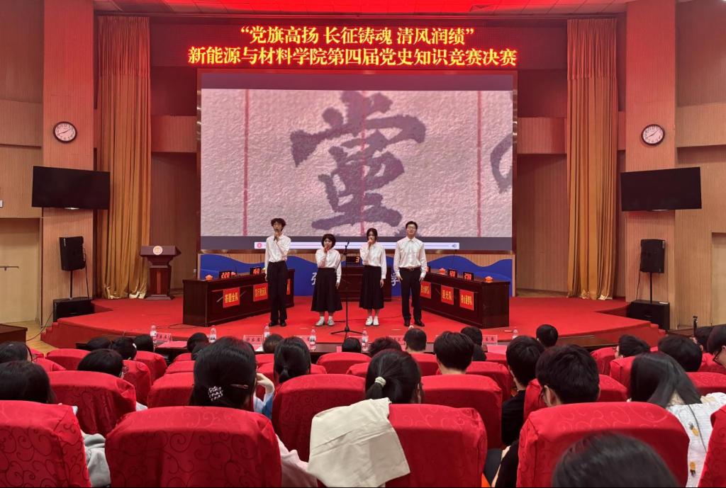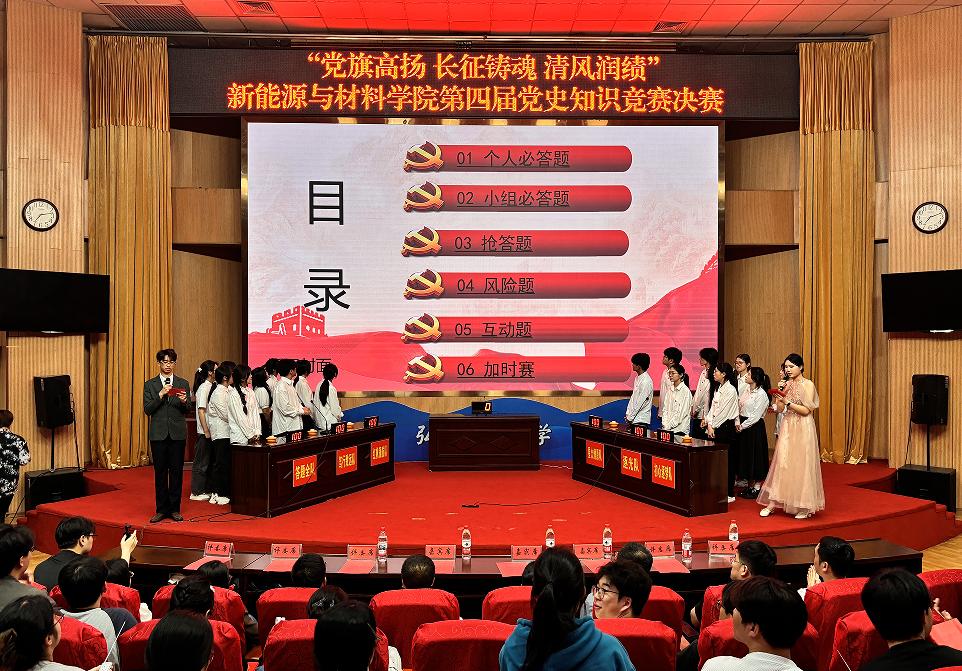 4月14日新能源与材料学院在图书馆报告厅隆重举行“党旗高扬 长征铸魂 清风润绩”第四届党史知识竞赛决赛。学院党委书记郭赛玉、党委副书记彭东翔,校纪委(监察专员办)综合室副主任孙创锦等师生代表共300余人到场观看。