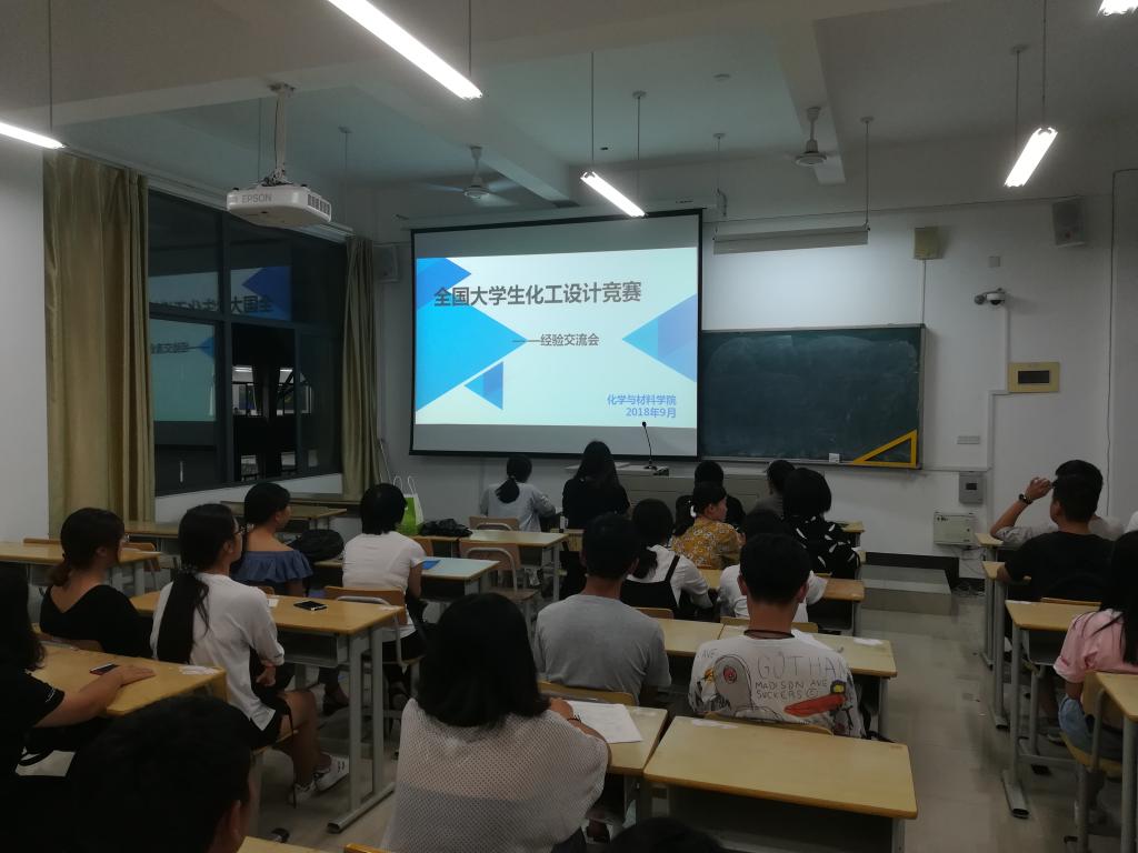 2018年9月12日,化学与材料学院在求实楼A404举办应用化学专业全国大学生化工设计竞赛经验交流会。黄剑华、郑美琴二位老师以及参加第十二届全国大学生化工设计竞赛的2015级应用化学专业学生和部分2016级应用化学专业学生一起分享了比赛的体会。交流会由郑美琴主持。