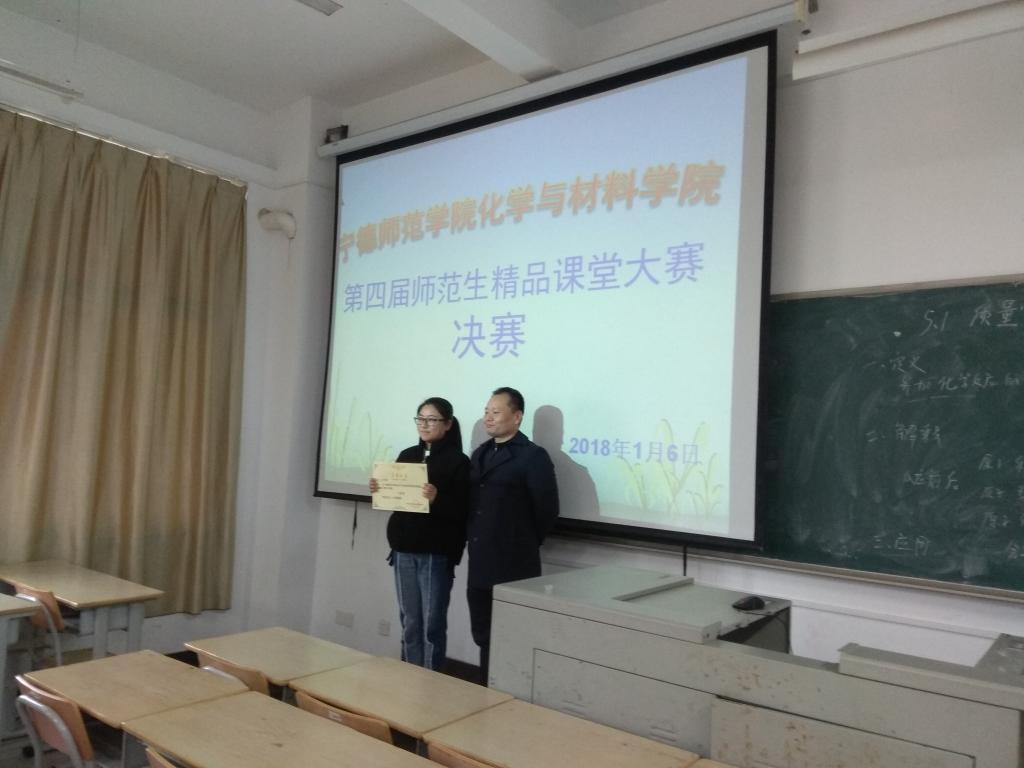 大赛分预赛和决赛两个阶段。本次赛事精心选拔出12位选手进行预赛,最后选出7位选手进入决赛。2018年1月6日,决赛于宁德师范学院东侨校区求实楼B405举行。决赛特邀了宁德进修学院和蕉城中学的2位高级教师以及化材院的5位教师担任评委。经过激烈的角逐,陈弘颖同学最终夺得一等奖,邱艳婷和陈晓丹获得二等奖,黄巧玲、郑茂钦、陈清箭及蔡惠皇四位同学获得了三等奖。比赛中,不仅有2014级的同学前来观赛,同时还有2015级化学专业及其他专业的同学前来观摩学习,为今后的实习提前做好准备。赛后两位外聘教师还对选手教学设计和教学过程的重点难点的掌控、教学情境的设计及师生互动等方面进行了精彩的点评,同学们感到受益匪浅。(薛岚 供稿)